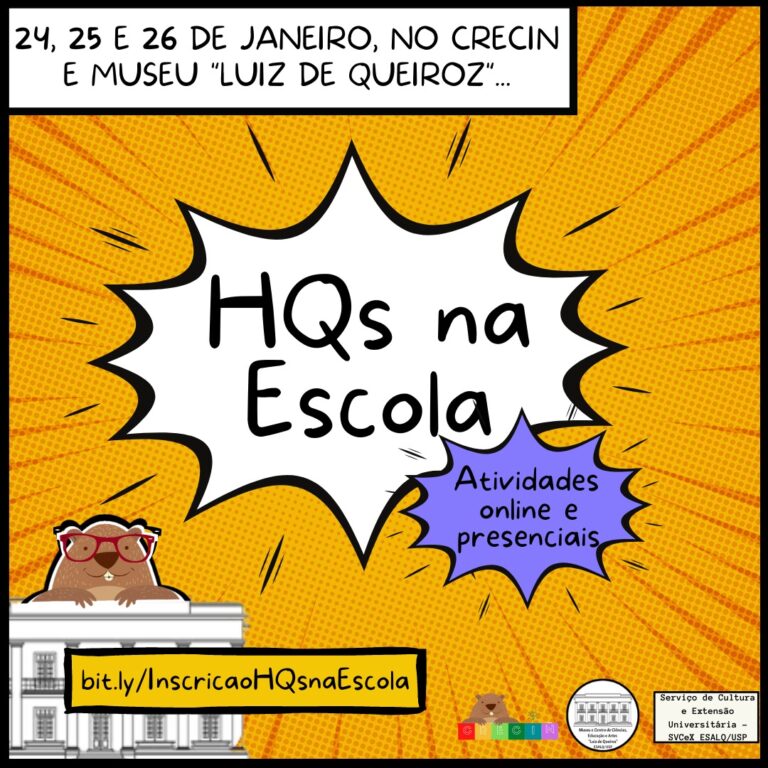 De 24 a 26 de janeiro acontecerá o “HQs na Escola”. A atividade é organizada pelo CRECIN – Centro de Referência em Ensino de Ciências da Natureza, juntamente com o Museu “Luiz de Queiroz” e o Serviço de Cultura e Extensão, ambos da Escola Superior de Agricultura Luiz de Queiroz (Esalq/USP).
