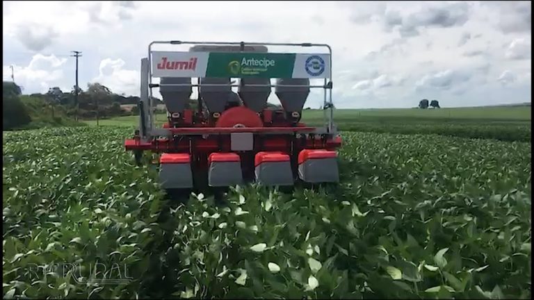 Excelente pergunta. O planejamento do Antecipe não começa na hora em que vou plantar o milho no meio da soja, tenho que começá-lo na soja. Algumas características são extremamente importantes. Uma delas é justamente o que você comentou: a escolha da cultivar. Então, a gente pode escolher tanto cultivares de ciclo precoce como semiprecoce, hábito determinado ou indeterminado, e a gente opta por cultivares que atinjam até no máximo 1,20m de altura, que tenham inserção da primeira vagem acima de 10cm, que não tenham essa capacidade de ramificação excessiva para as entrelinhas. Pois existem cultivares no mercado que apresentam como diferencial a ramificação. Isso não limita o Antecipe, porque o protetor em cada semeadura já empurra as ramificações para as laterais. Mas é recomendado que, ao escolher essas cultivares de ramificação, o produtor adote muito bem o estande de plantas. Porque uma coisa é a ramificação por falha. Se eu tiver falha entre uma planta e outra, essa ramificação excessiva vai para o sentido da entrelinha. Ou se ele aperta demais o estande, a tendência é ramificar para os lados. Então, escolher uma cultivar que tenha um porte mais ereto, que permita você transitar uma velocidade de trabalho compatível para plantar o milho é muito desejado. Outro fator muito importante é o trator, que é tão importante quanto a semeadora. Então o trator que vai trabalhar acoplado na máquina tem que ter o rodado dianteiro ou traseiro que permita transitar entre a soja. Se a soja está a 50 centímetros, eu tenho que usar um pneu que permita transitar sem causar amassamento da soja. Muitas vezes, o amassamento da planta ocorre por causa do pneu, não da semeadora. O produtor tem que olhar o vão livre vertical, ou seja, a altura do trator do ponto mais baixo até o solo, e tem que ser no mínimo 40 centímetros de altura. Não usar o trator que tenha 40 ou menos centímetros de altura. Porque vai conseguir pegar no centro da soja, vai fazer esse movimento de ir e voltar. Outros pontos importantes: tem muito produtor que gosta de fazer o arremate de talhão, que – em muitas regiões – o pessoal chama de “varanda”. O plantio cruzado no final do talhão. Se for plantar o Antecipe, você pode fazer isso. Mas se você tiver um corte automático de seção na sua semeadora de verão, porque assim não causa o amassamento de muitas plantas de soja. Se você não tiver, o recomendado é que não faça essa varanda porque a máquina vai transitar no meio da soja. E, quanto mais plantas amassadas, mais assustado o produtor fica com a tecnologia. Então, não há uma limitação para esse pichamento, mas é aconselhado que você reduza dependendo do talhão que vai fazer.