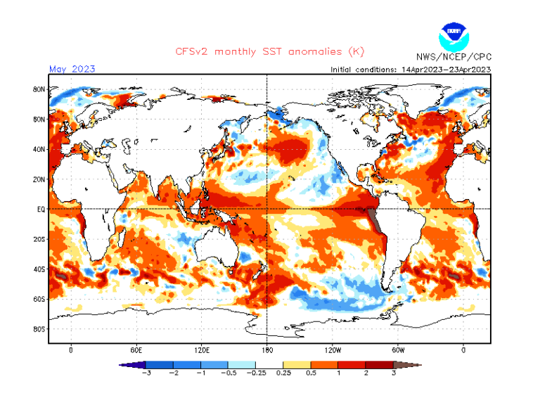 Para os próximos meses, a probabilidade é que as precipitações fiquem em torno da normalidade em grande parte do Brasil, com volumes abaixo no setor norte da região Nordeste. Ou seja, ainda que as águas superficiais do Pacífico Equatorial estejam mais aquecidas, a atmosfera responde à condição de neutralidade climática neste próximo trimestre. Por enquanto, tudo indica que a influência do El Niño deve se dar ao longo do segundo semestre de 2023.